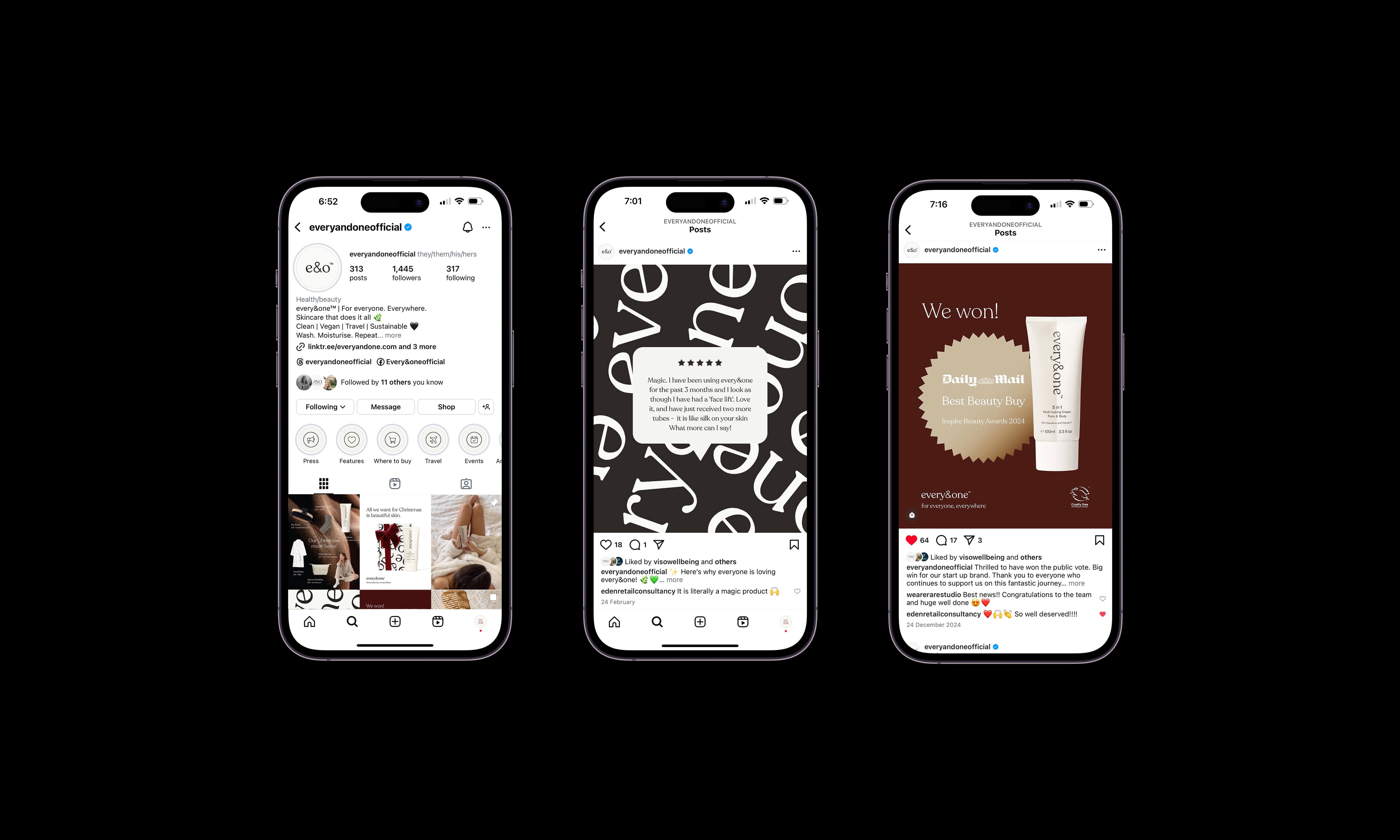Having developed an innovative multi-tasking 5 in 1 skincare cream, every&one hired us to develop their brand identity, packaging and website design in order to bring the product to market. We wanted to create a visual aesthetic that felt both gender neutral, and appealing to a broad age range, while having sufficient impact to stand out amongst its competitors. The final result uses contemporary, neutral cues with the addition of bold black and white typography and a vertically split tube design for maximum shelf appeal. We then brought the brand to life via the design and development of a bespoke Shopify website to give the brand all the tools it needs to focus on growth and expansion.